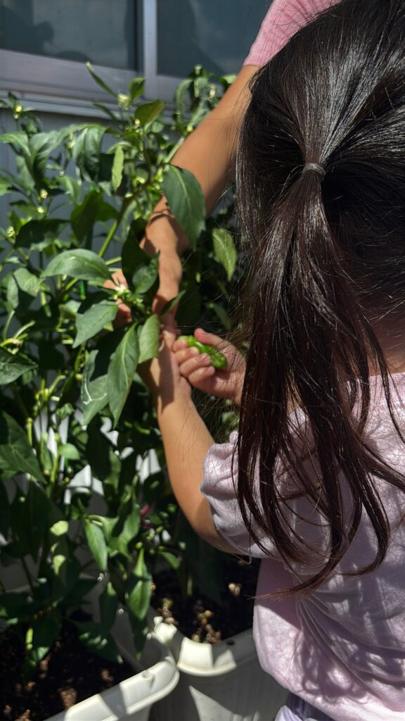 自分でとったピーマンは、自分で手に持ってお教室に戻りましょう😉
