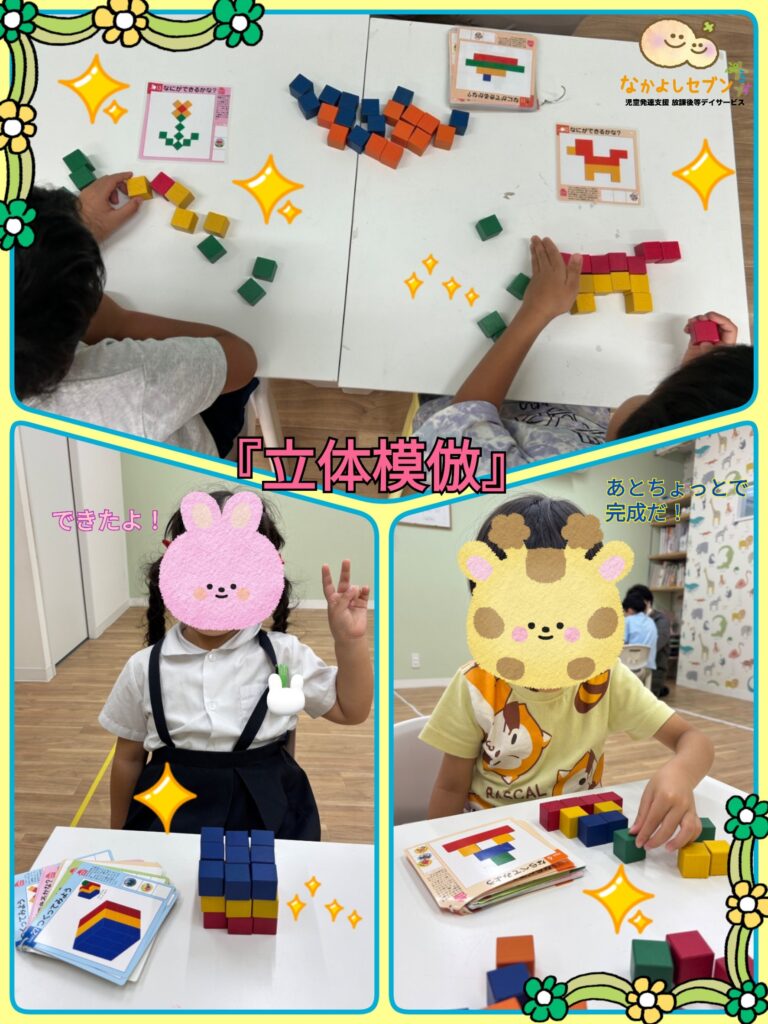 集中力が身に付くことで、就学後の座学に繋がります。小学校では1コマ約45分の授業×5コマが始まります。集中力UPで、授業に慣れやすくしていきたいです📚細かい作業なのでほんのちょっと触るとパーツがずれたりもするのでイライラする子も…こらえ性も試されますね。