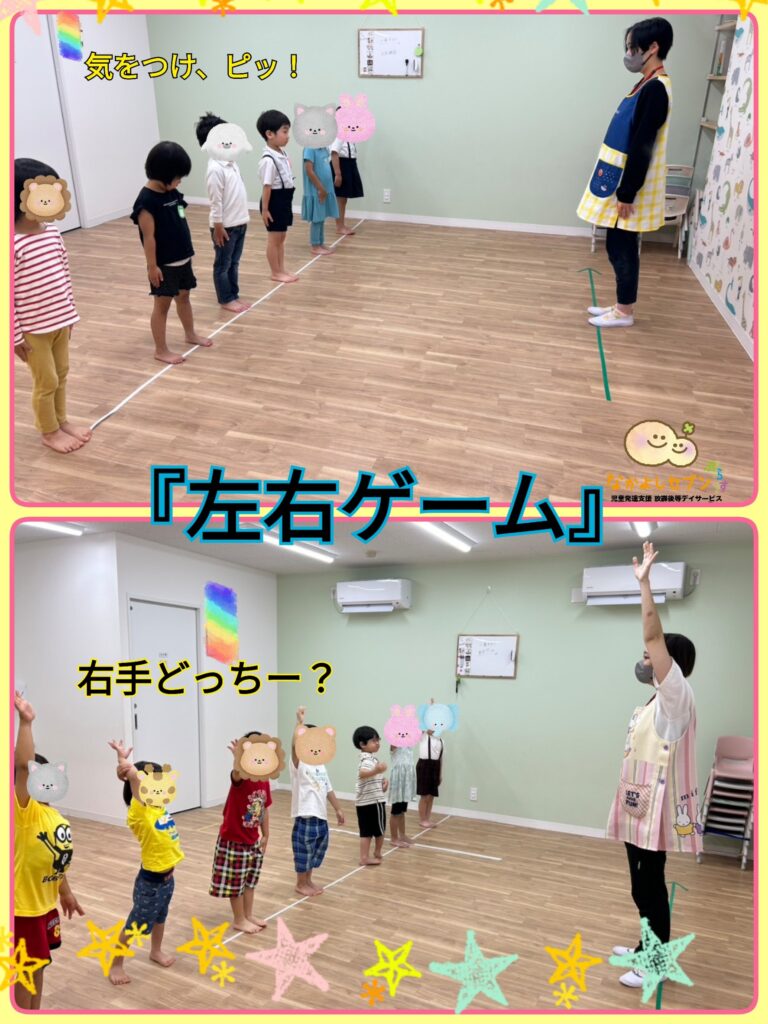 みんなで一斉に行う「左右ゲーム」では、先生の言われた方向に体を向けたり手を挙げたり🙋