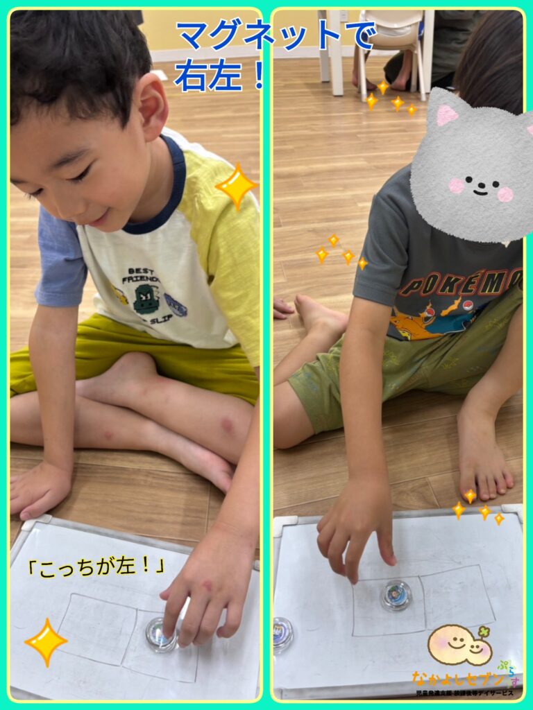 「上(下)・右(左)から〇番目?」では、ホワイトボードに2~5個の部屋を描き、先生の「〇から〇番目の部屋に入れてください」の言葉を聞いて、マグネットを部屋の中へ動かします。ちょっとしたゲーム感覚で出来るので、子どもたちは楽しんでいる子が多いです😄