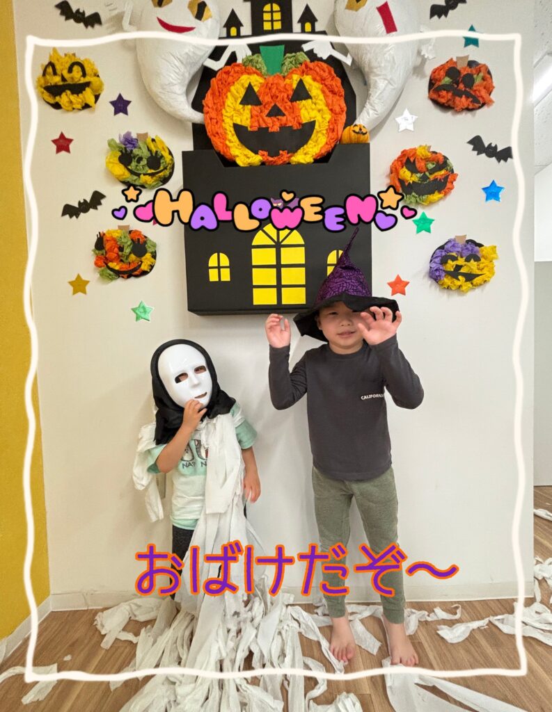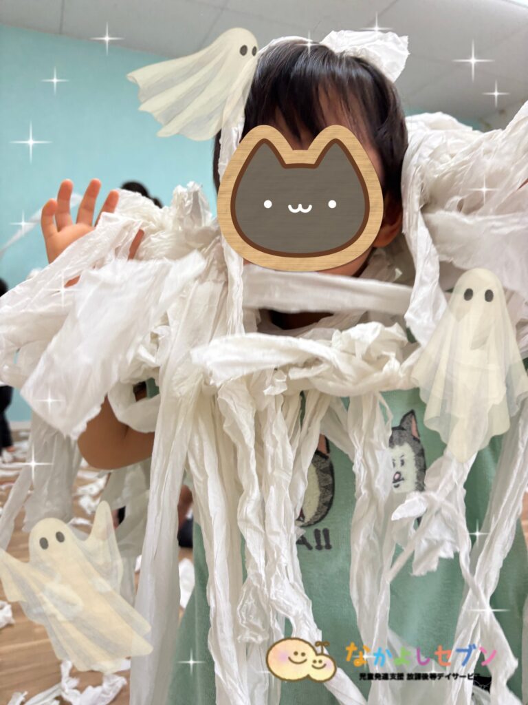 体中にペーパーを巻き付けて、ハロウィンの仮装でおばけごっこも体験しました👻
