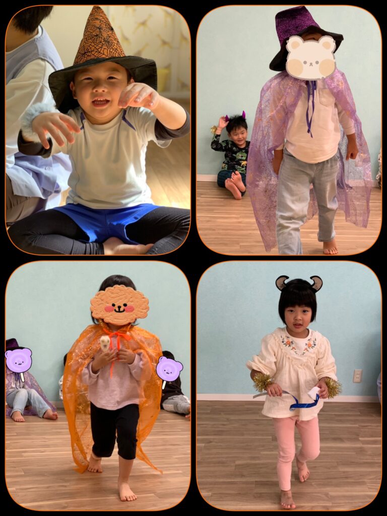 体にペーパーを巻いたり、帽子やお面を身につけ、いつもはしない体の動きを通して、自分の体の面白さに気づくきっかけになってくれたらいいなぁ🥰と思います🎃