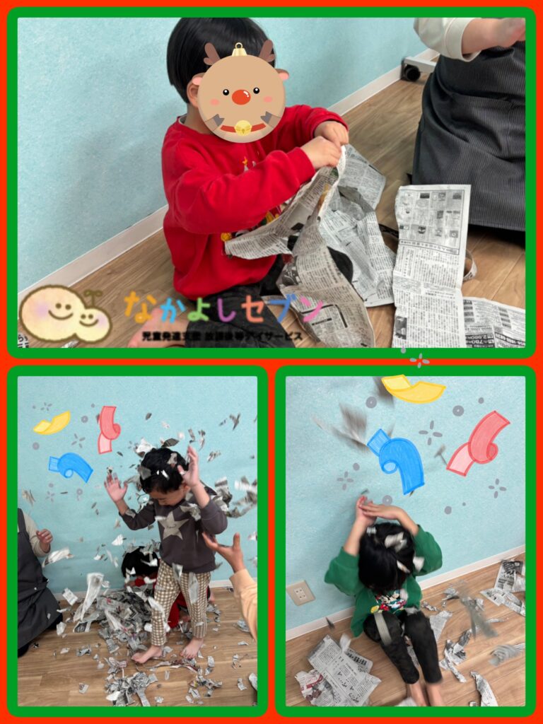 指先に力を入れて紙を破ったり、両手を使って大きくちぎったりと、一人一人が自分のペースで参加できましたね✨お部屋の中に雪を降らせました⛄楽しかったね☺️